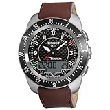 Cassa in titanio con un braccialetto in pelle marrone. Lunetta fissa. Quadrante nero con lancette luminose e marcatori arabi e bastone ora. Movimento al quarzo. Vetro zaffiro antigraffio. Diametro cassa: 43 mm. Spessore della cassa: 15,05 millimetri. chiusura di distribuzione. Impermeabile fino a 100 metri (330 piedi). Funzioni: ore, minuti, secondi, cronografo, barometro, altimetro, termometro, bussola. Tissot T-Touch Expert Guarda T013.420.46.207.00.Bold e robusto, il Tissot T-Touch Expert Nero Carbonio Quadrante Wa